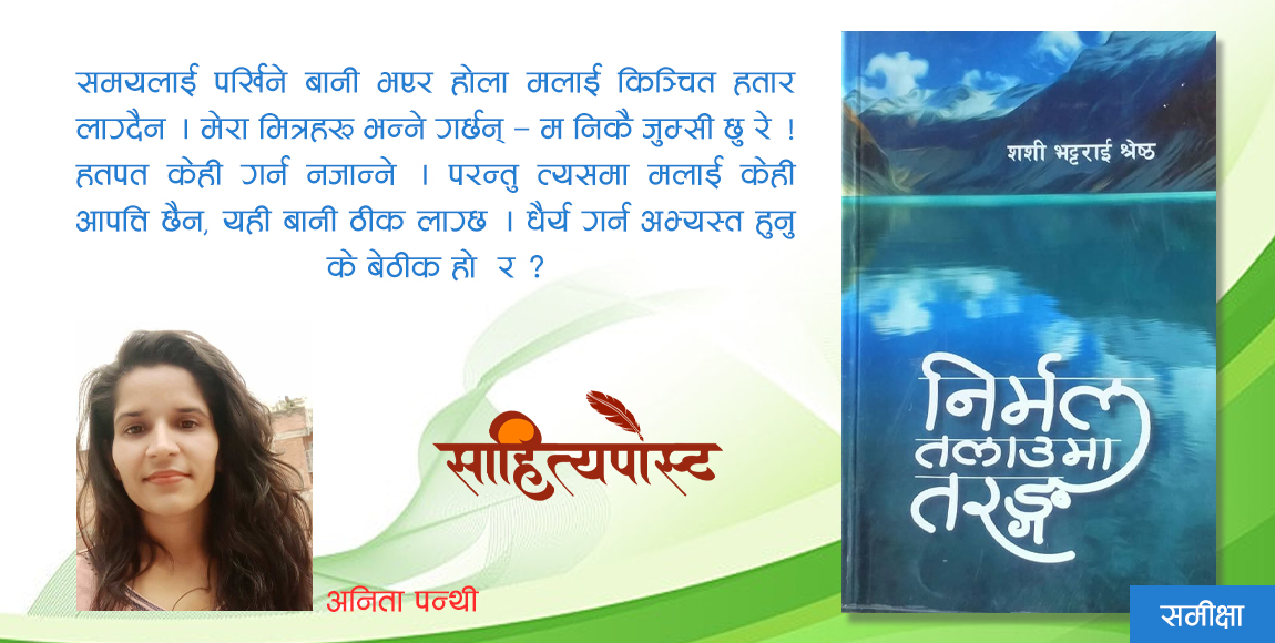 त्यो समयदेखि पढ्दै आएका शशी भट्टराईका कविताले कृतिको आकार लिइसकेछ कति छिट्टै— निर्मल तलाउमा तरङ्ग । खरायोको गति बरु अलिक सुस्त होला । उनको गति, त्यति द्रुत लाग्यो । ती कविता तलाउजस्तै निर्मल छन्, गहिरा छन्, तरङ्ग उत्पन्न गर्ने छन्, यही सुन्दै आएकी थिएँ पाठकमाझ ।