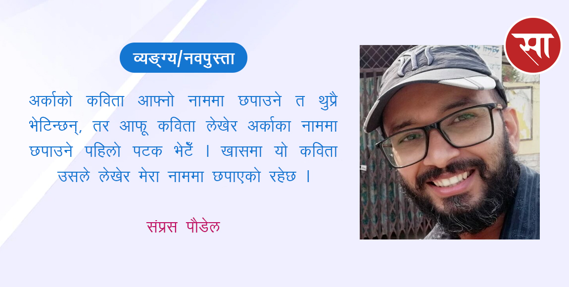 अर्काको कविता आफ्नो नाममा छपाउने त थुप्रै भेटिन्छन्, तर आफू कविता लेखेर अर्काका नाममा छपाउने पहिलो पटक भेटेँ । खासमा यो कविता उसले लेखेर मेरा नाममा छपाएको रहेछ । न धुँदा जाने, न रुँदा जाने । म लाजले रातोपिरो भएँ । अब त मलाई नै भेट्न ऊ नेपाल आयो, म यही मौकामा विदेश छिरूँ कि कसो ! जदौ ।